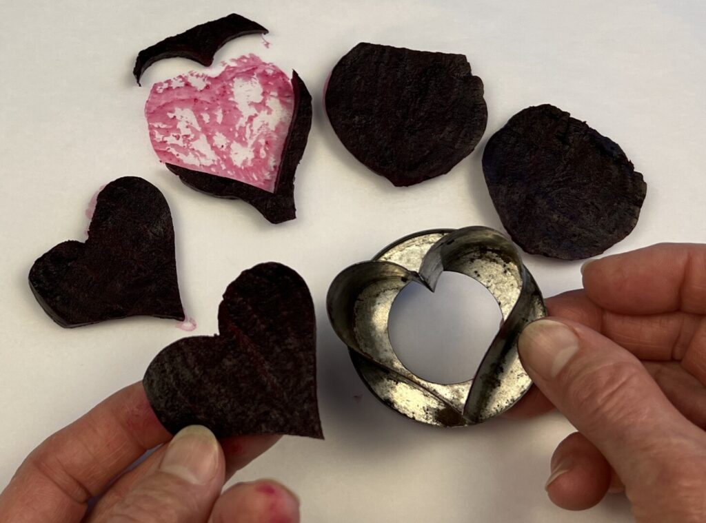 While the oven is preheating, fabricate the “heartbeets.” Slice them lengthwise, a little thicker than 1/8 inch. Use a heart-shaped cutter—or get creative and cut them freehand with a knife.