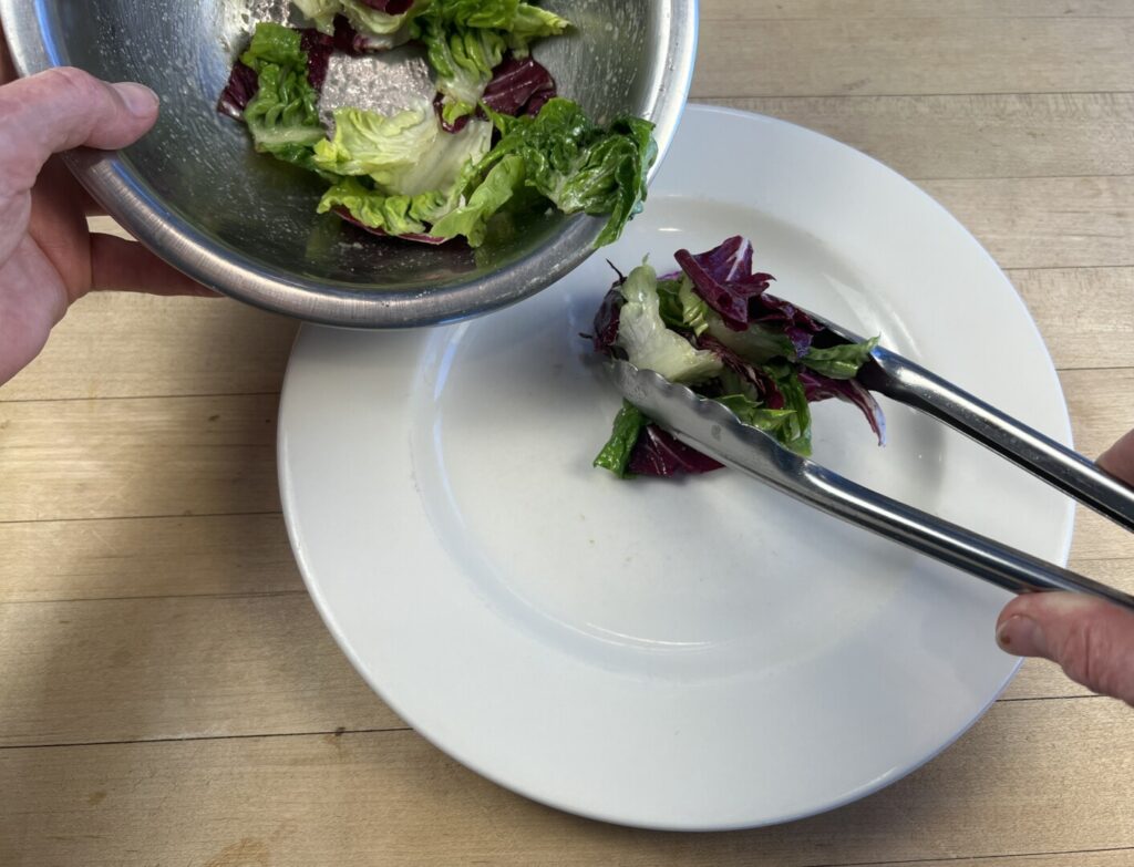 - Mound a portion of salad on the back right of each slightly warmed plate.