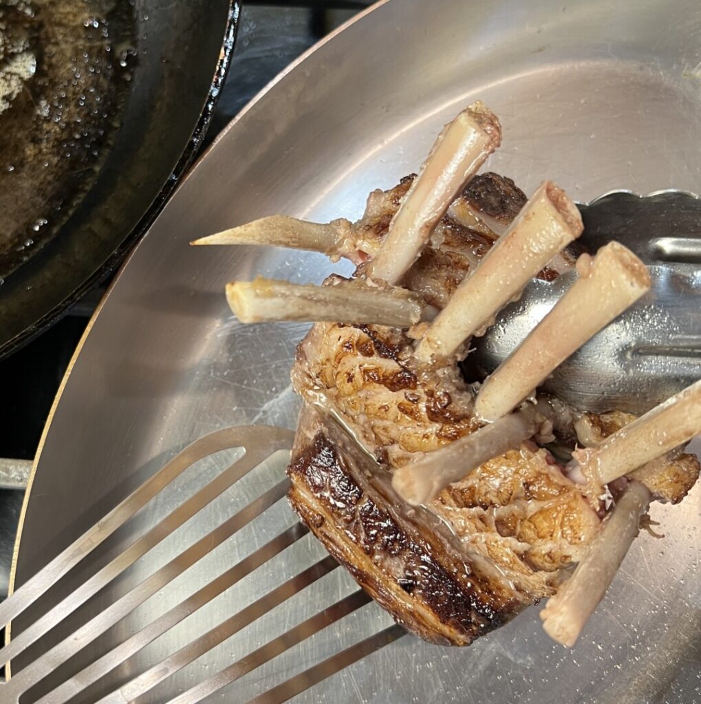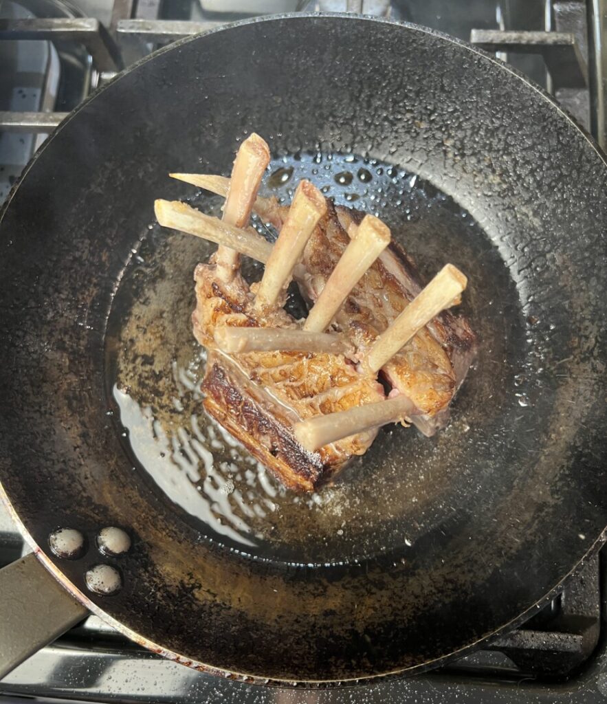 - Turn over the racks and arrange them upright in the pan, with rib bones intertwined as before. Sauté about 30 seconds longer.