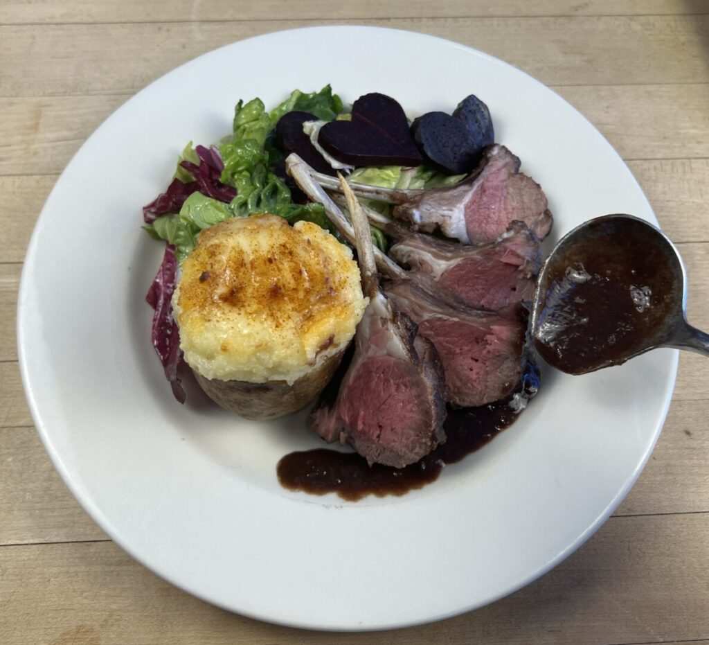 Roast Rack of Lamb with Red Wine-Shallot Jus, Twice-Baked Potato, and “Heartbeet” Salad