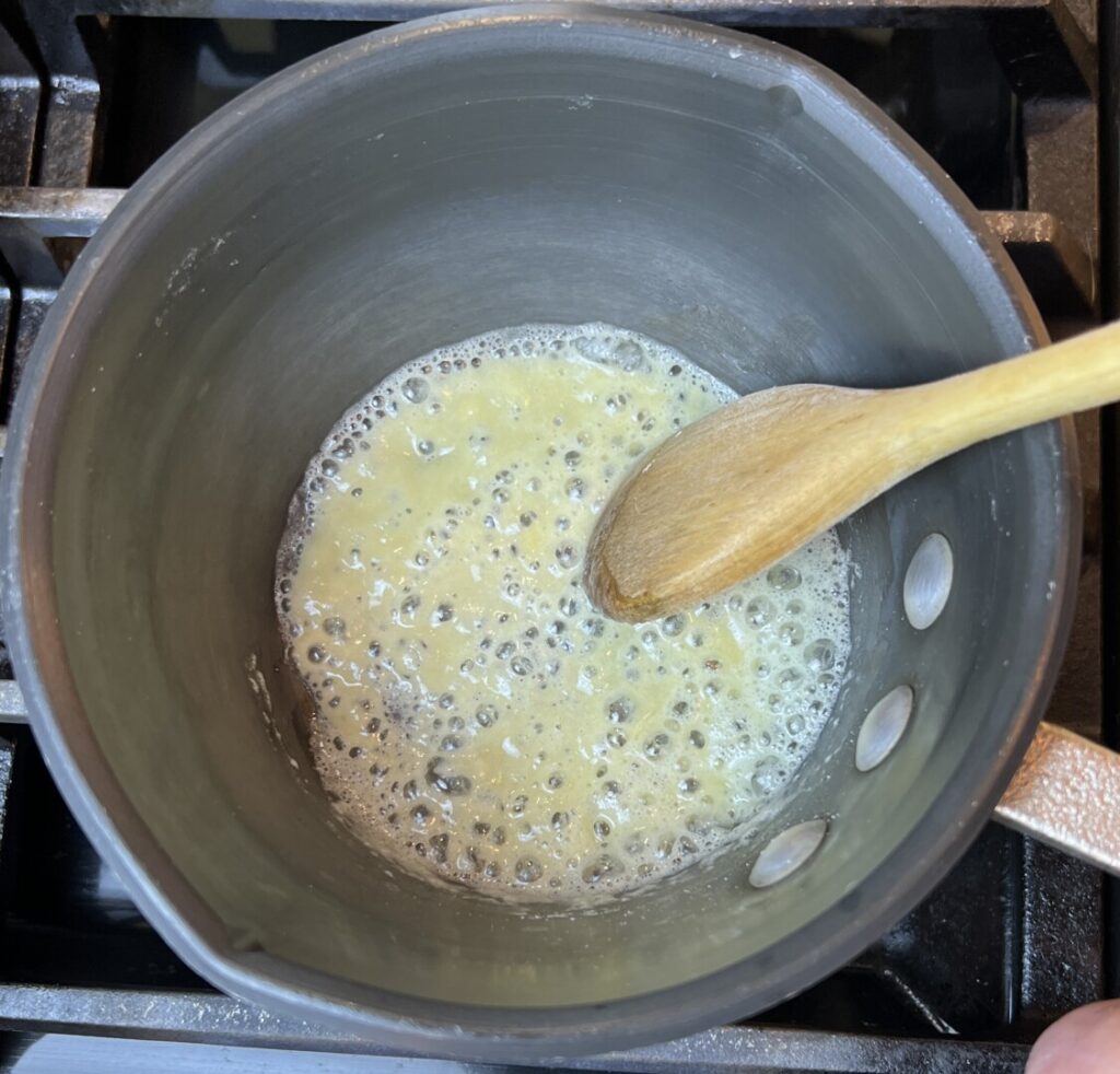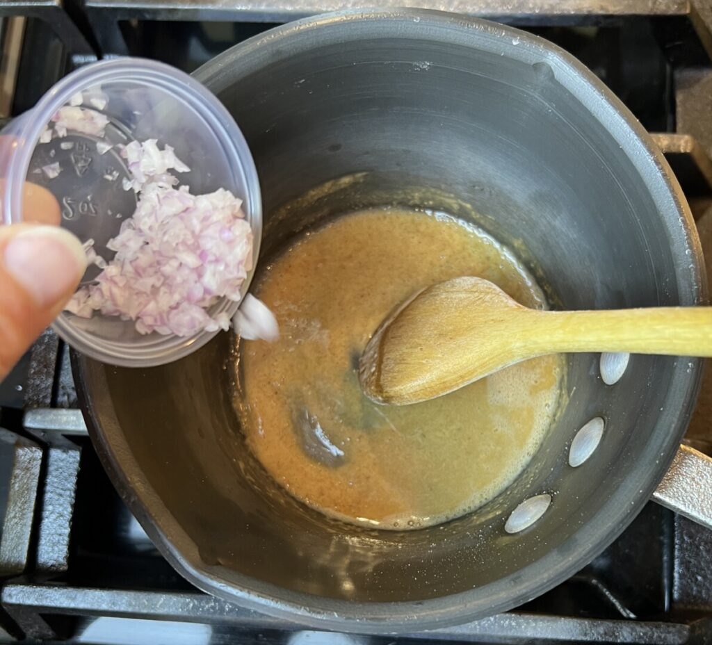The sauce base starts with a brown roux: butter and flour cooked together until it achieves a rich, golden-brown color. Brown roux has less thickening power than white or blonde roux, but imparts a deep, Maillard-reaction savory flavor and a rich brown color to your sauce. Cooking minced shallots in the roux adds a hint of sweetness, then beef bone broth is added in a thin stream to prevent lumping. After 20 minutes simmering, add the reduced wine and the sauce base is complete.