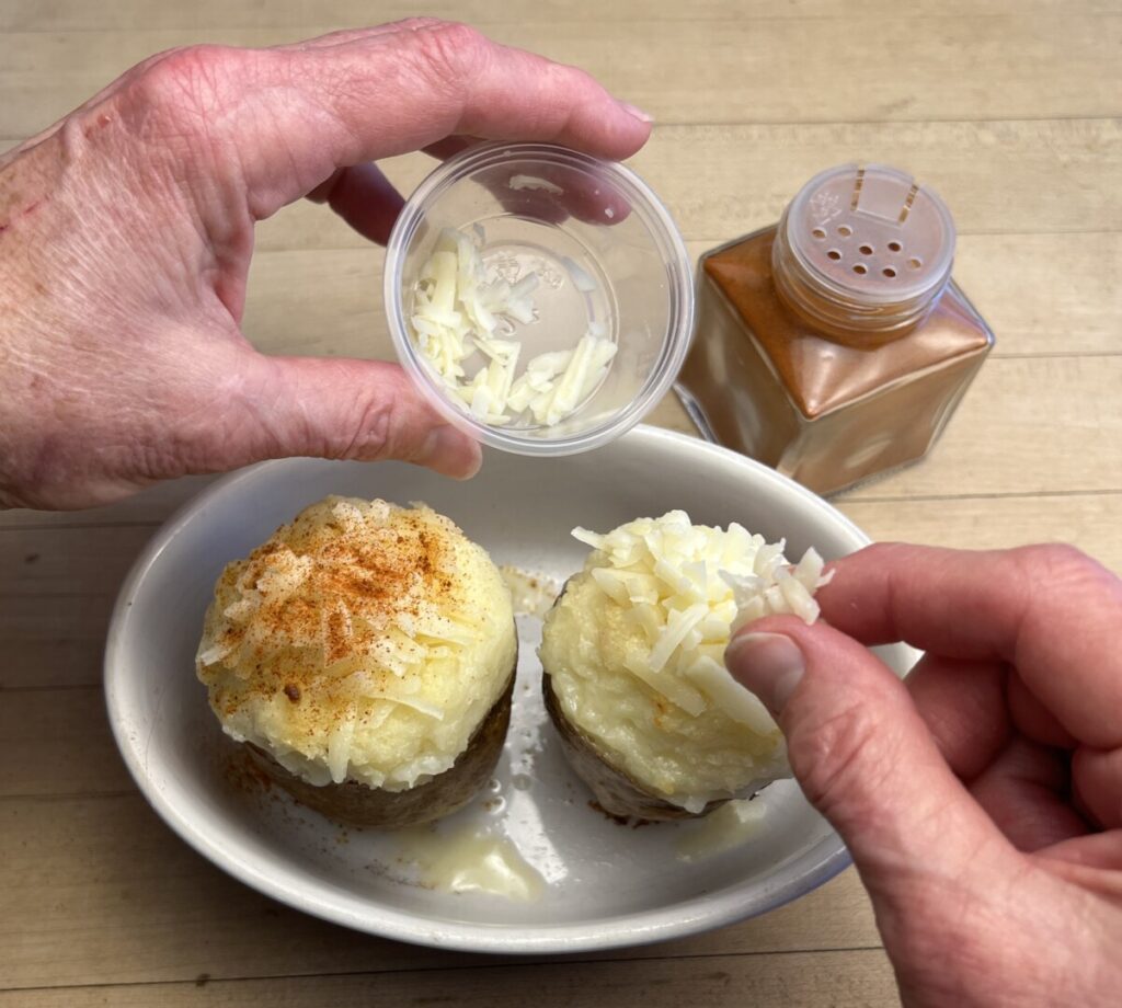 Next, you’ll start re-baking the potatoes. After 30 minutes in the oven, carefully peel off the foil “collars.” Top the potatoes with more cheese and paprika, and finish baking golden brown.