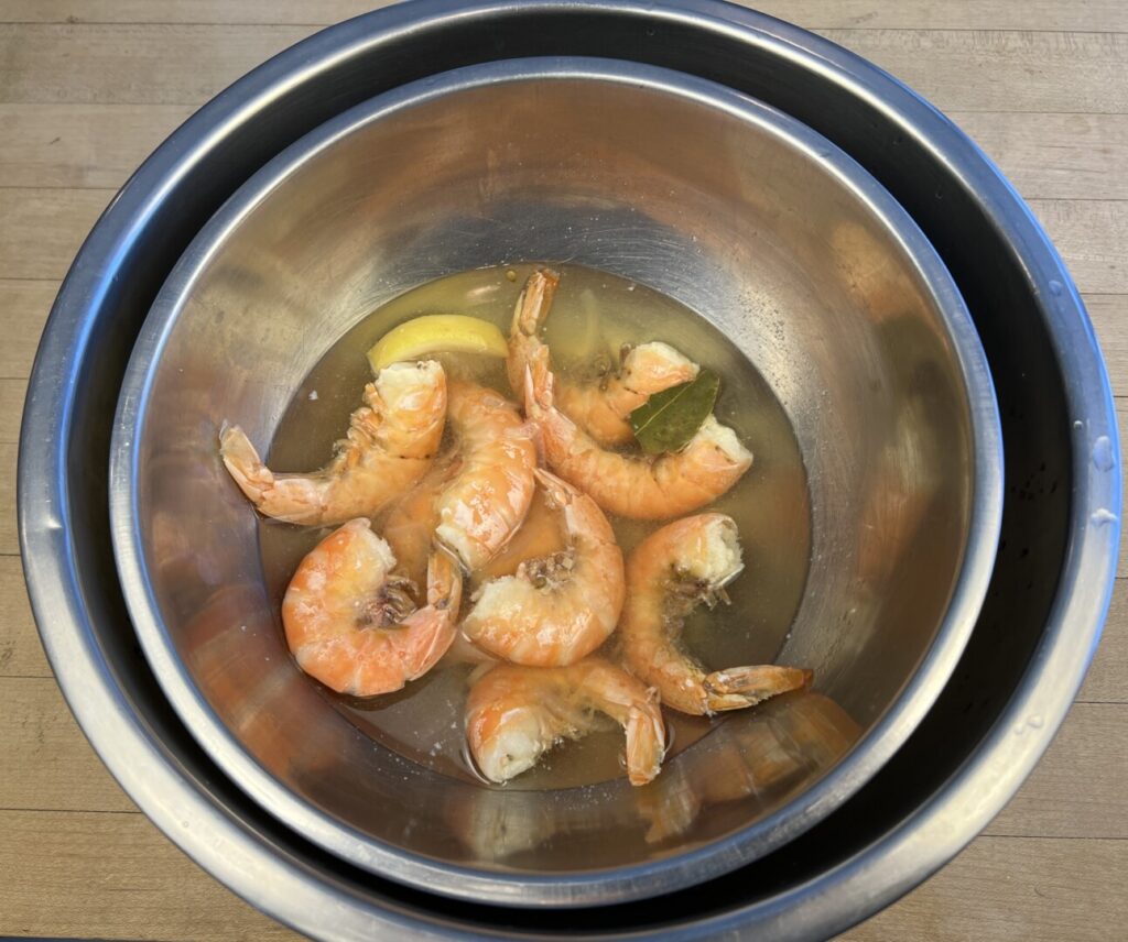 Poaching is a moist-heat cooking method that involves cooking food completely submerged in a flavorful liquid—called a cuisson—at a low simmer. The cuisson for this dish is a blend of water, white wine, lemon, and seasonings. Cook the shrimp until they acquire a vivid pink or coral color, and cook them only until they just begin to curl. Shrimp cooked until they form tight rings are over-cooked, and have a tough, dry mouthfeel. Stop the cooking by placing the saucepan in an ice water bath. Peel them, leaving the tails on “cocktail-style” as convenient handles for eating with your fingers. Refrigerating the shrimp in their cuisson helps them remain moist and further develops their flavor.