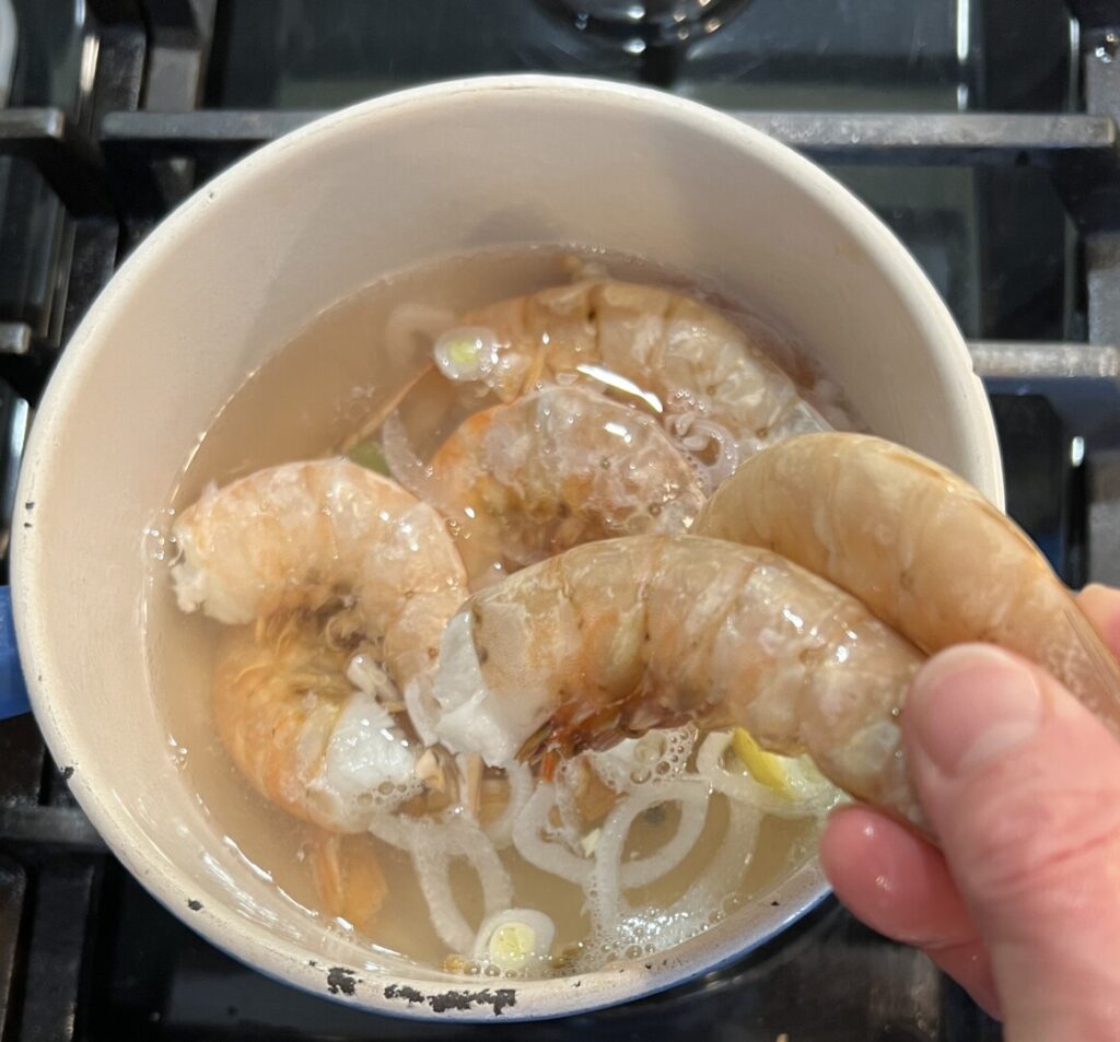 - Rinse the shrimp under cold water, shake them dry, and add to the cuisson in the saucepan. If the shrimp aren’t completely submerged, add more water.