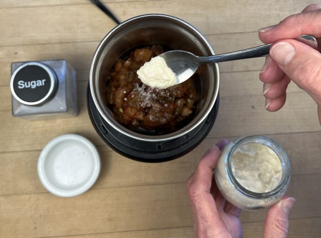 - Chop the tomato and add it to a wet-dry spice grinder or mortar. Add the horseradish, sugar, and salt. Purée very briefly, without incorporating much air. (Alternatively, mash together in a small bowl.)